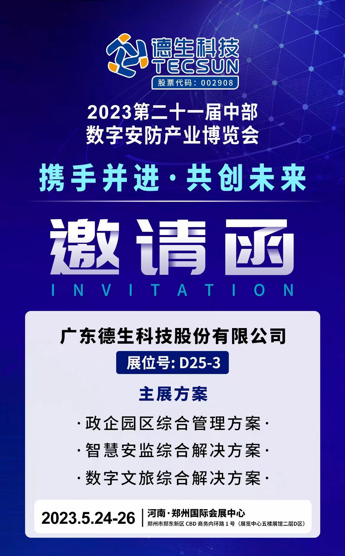 广东德生科技股份有限公司有幸受邀参加第二十一届中部数字安防产业博览会,作为参展方,德生将主要展示政企园区综合管理方案、智慧安监综合解决方案、数字文旅综合解决方案,向参展人员展示德生实力。